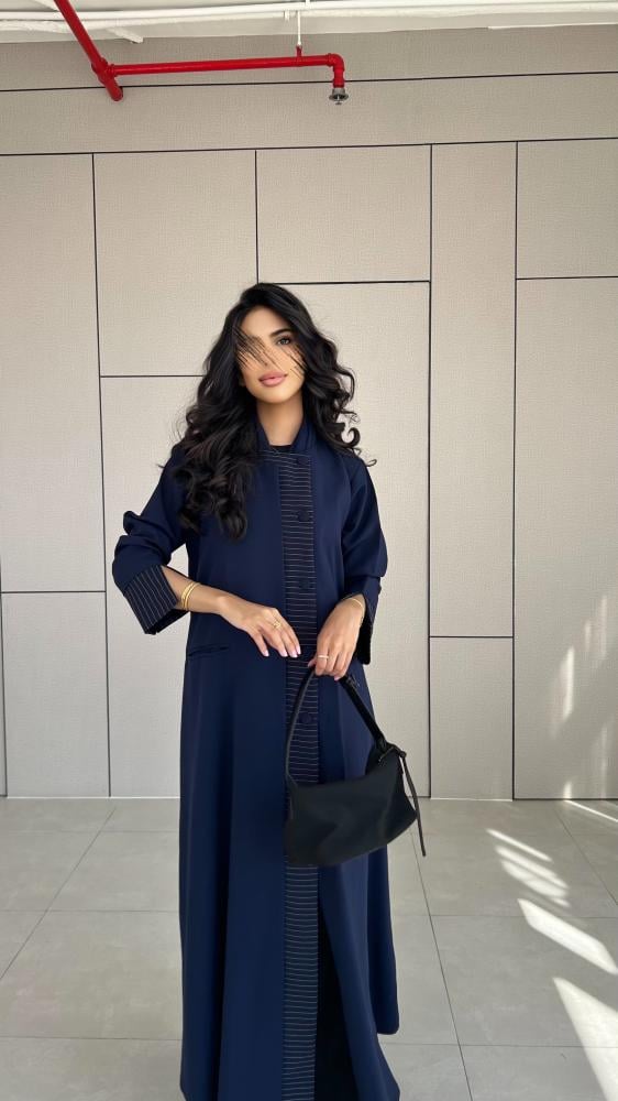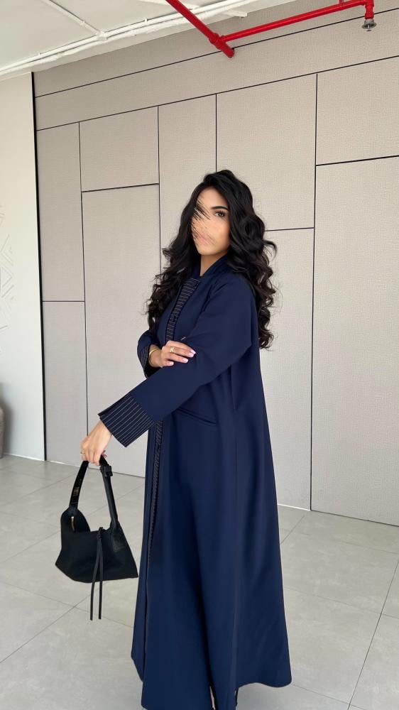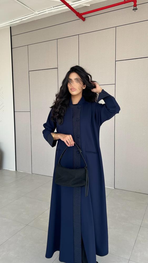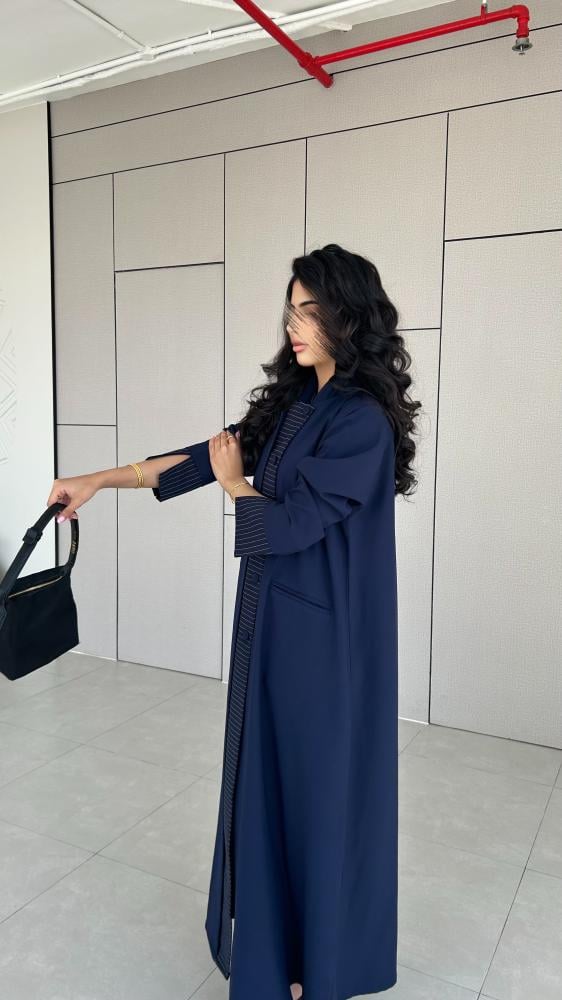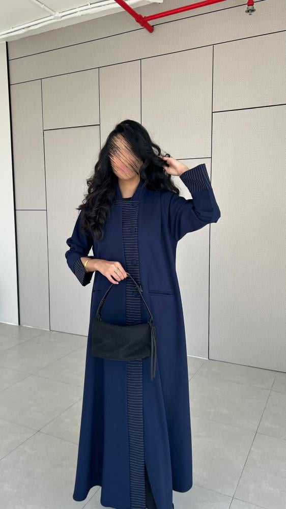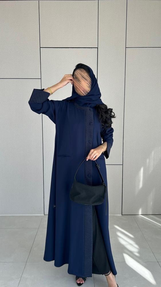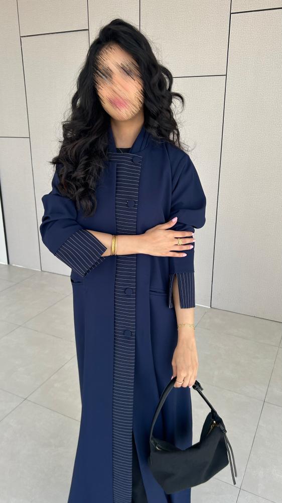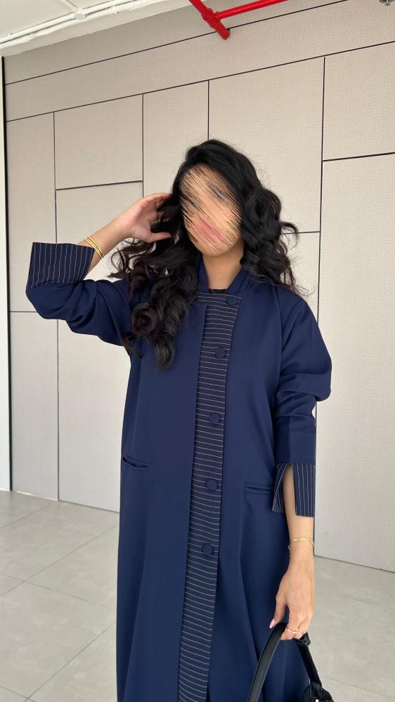 القماش : كريب كحلي مع تدخيله كريب مقلم باللون الكحلي والابيض